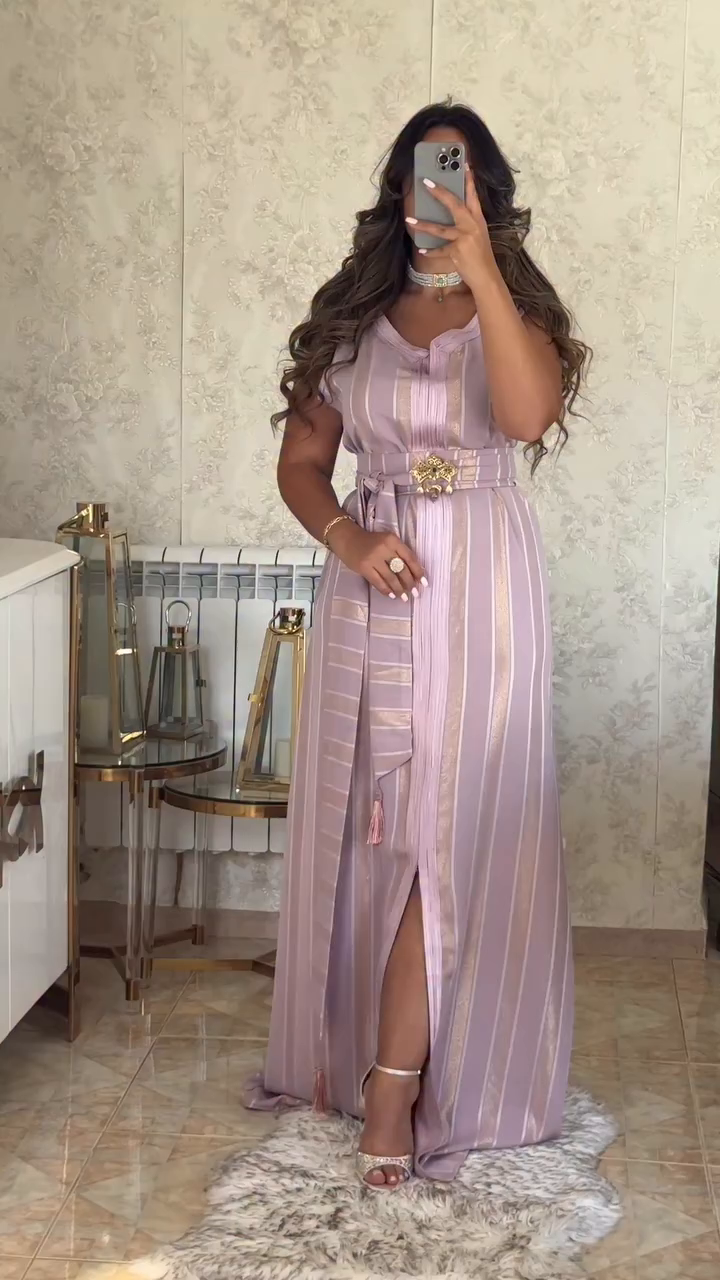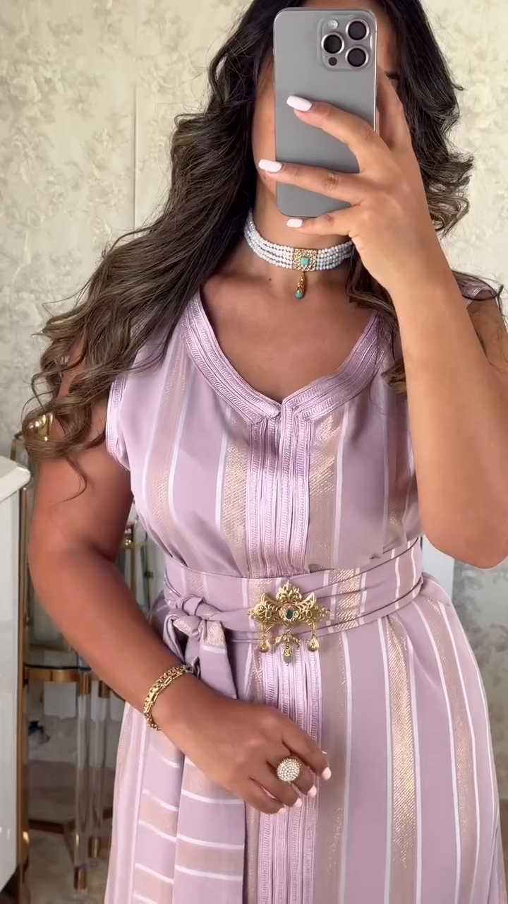 Plongez dans l’univers raffiné de la collection Nedjma avec ce modèle unique en crêpe premium, sublimé par des rayures lavande et or qui captent la lumière à chaque mouvement.