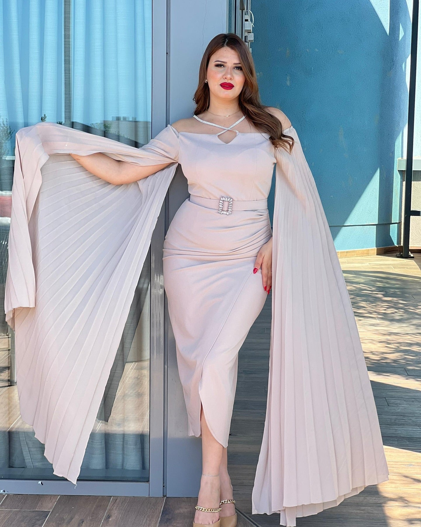 Grace meets sophistication in our Royal Elegance Cape Dress, now available in a stunning soft beige tone. Designed to highlight your natural glow, this dress is your go-to for elegant evenings and upscale events. The flowing pleated cape sleeves and off-shoulder neckline create a silhouette that’s both regal and effortlessly feminine.